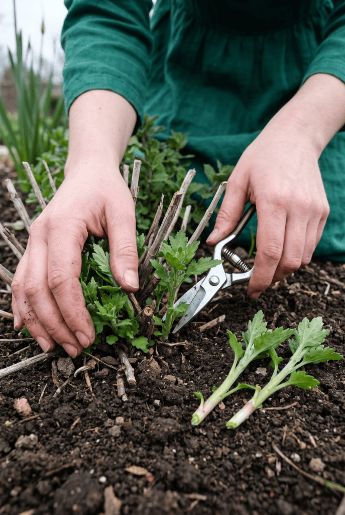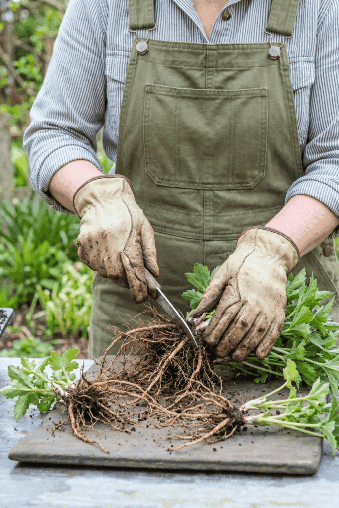 In April, we take basal cuttings when the young shoots reach about 3 inches (7.5 cm) and still feel firm inside — not hollow. That small heel of woody base you include? That is where the real rooting energy sits…