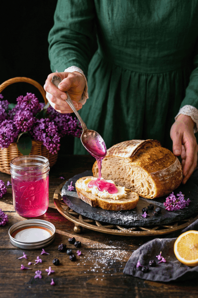 Pair it with cheese. Soft, creamy cheeses like brie, chèvre, or camembert are stunning next to lilac jelly. Put it on a cheese board and watch people’s eyes go wide when you tell them what it is.