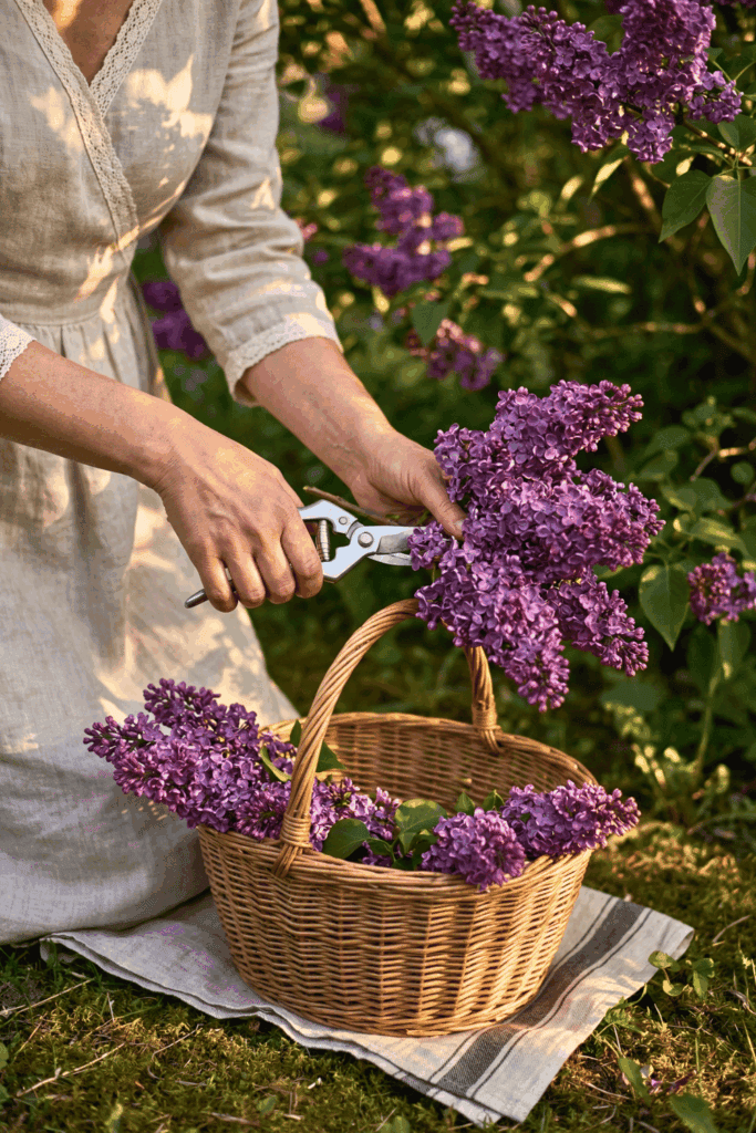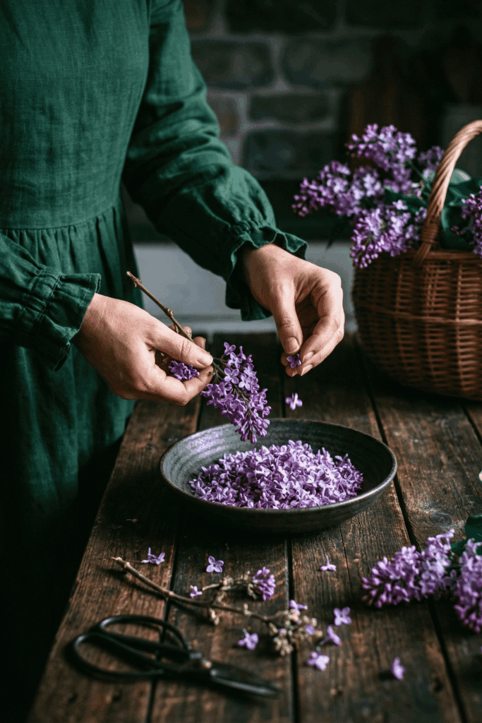 Timing matters here. You want to catch your lilacs when they’re freshly opened — about half to three-quarters of the cluster in bloom, some buds still tight, others fully unfurled. This is peak fragrance, peak flavor, peak everything. Go out mid-morning after the dew has dried but before the afternoon heat shows up and wilts everything.