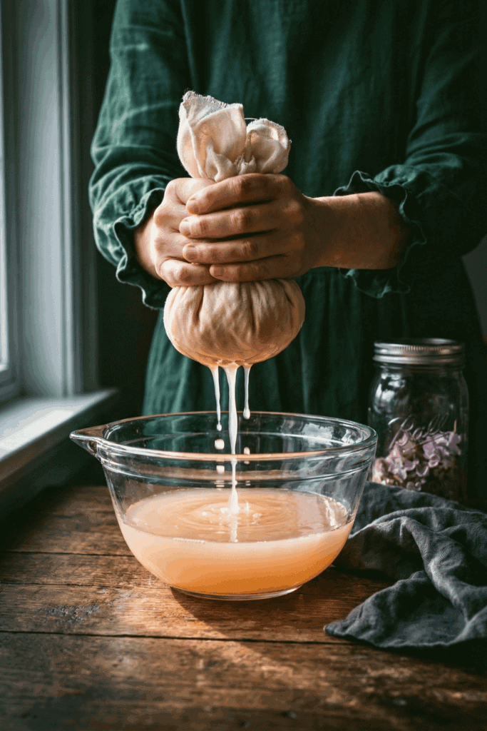 The next day, strain the liquid through cheesecloth. I squeeze the bundle hard—harder than you’d think polite—to get every drop. You should have roughly 3½ to 4 cups of liquid the color of pale rosé or apple blush. If you’re short, add a splash of water. If you have extra, drink it cold over ice—it’s essentially lilac lemonade.