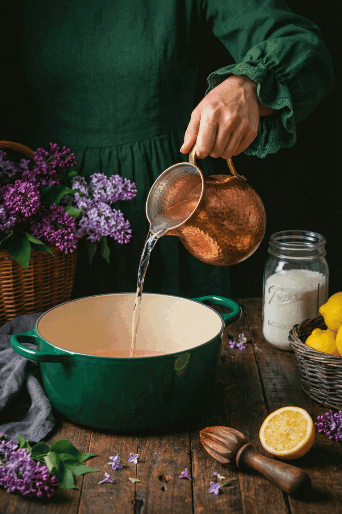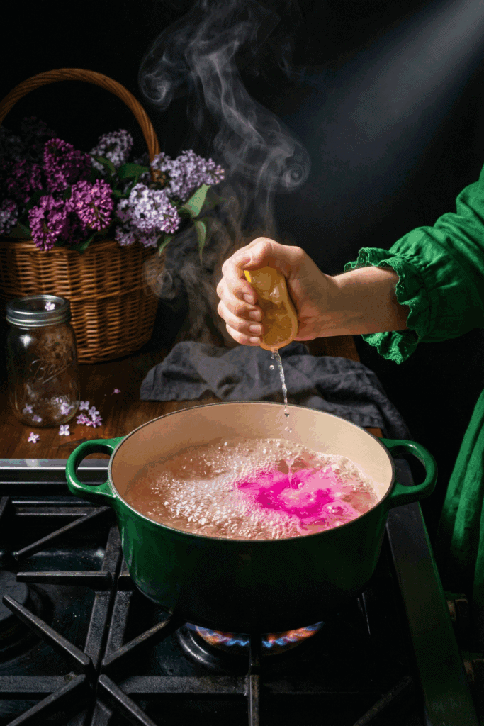 Pour the strained lilac tea into a large saucepan or jam pot. Add the lemon juice and watch the color change. Smile. Maybe gasp a little. It’s okay.