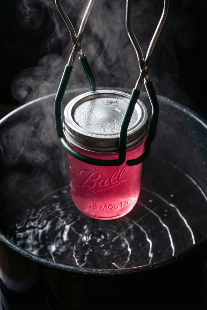 Ladle the hot jelly into prepared jars, leaving ¼-inch headspace. This is less than many canning recipes because low-sugar jellies expand less during processing. Wipe rims with a damp cloth—sugar crystals prevent sealing—apply lids fingertip-tight, and process in a boiling water bath for 10 minutes. Add 5 minutes if you live above 6,000 feet elevation.