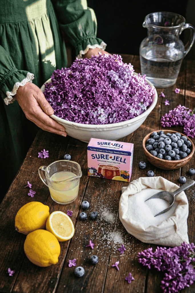 - A small handful of frozen blueberries (optional) — for color, especially if you’re using pale or white lilacs. They add enough natural pigment to make the jelly glow without changing the flavor one bit.