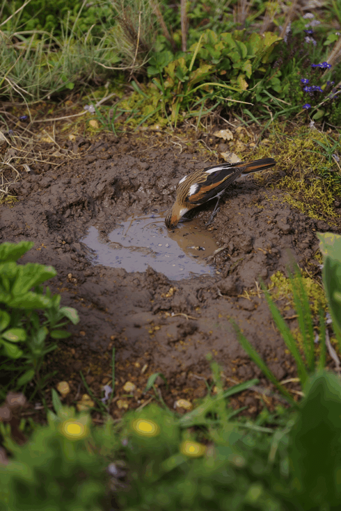 You don’t need to flood the yard. A low corner that stays damp after rain or a shallow dish of moist soil is enough. What may look messy to us is exactly what keeps pollinators and birds thriving.