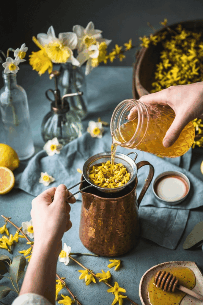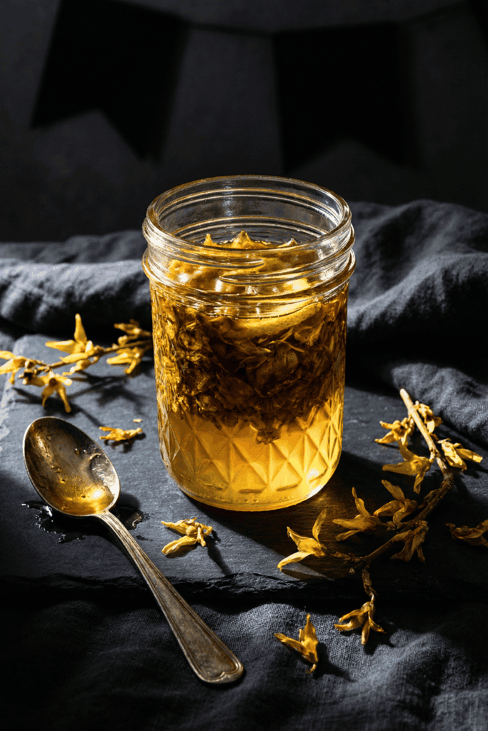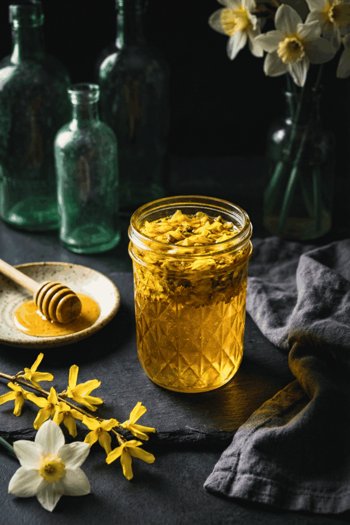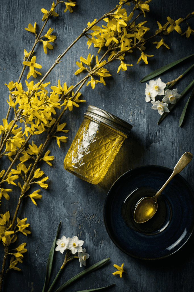 This golden syrup tastes like April in a jar. Sweetened with raw honey and scented with fresh forsythia flowers, it takes twenty minutes of gentle simmering and an hour of patience while the blossoms steep. Pour it over yogurt, stir into tea, or brush onto roasted chicken while the spring hedges are still blooming.