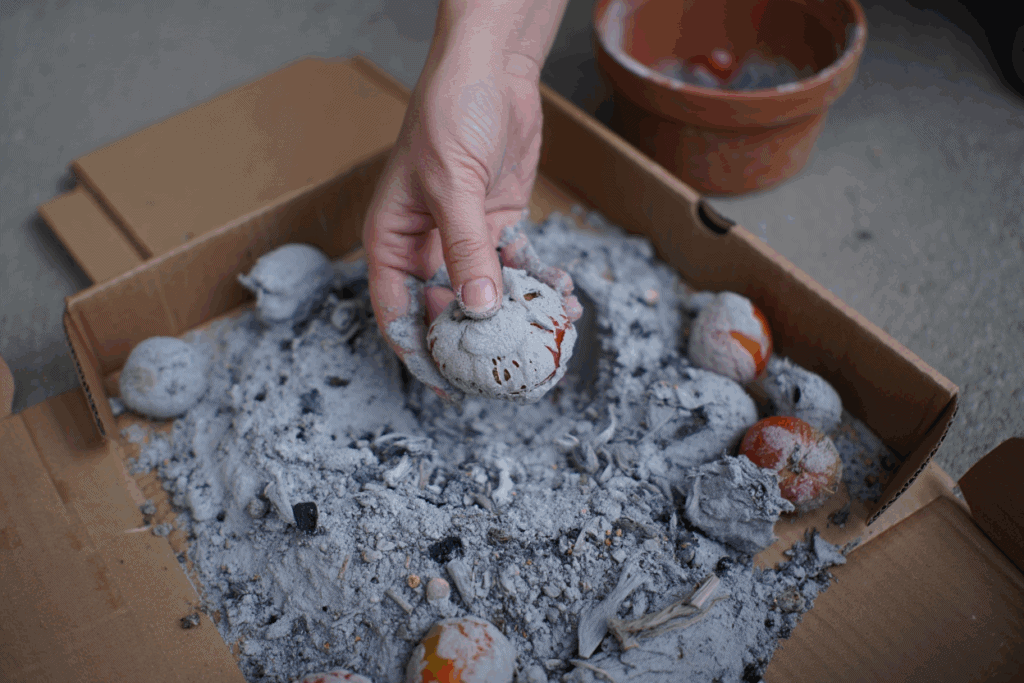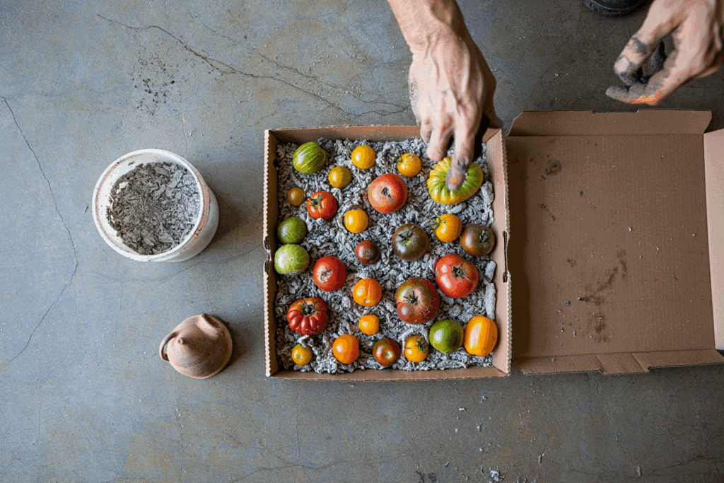 Gently pour more ash over the tomatoes until they’re fully covered. You shouldn’t be able to see any part of the tomato. If you have more tomatoes, repeat the process—ash, tomatoes, ash—until you’ve stored them all. Always finish with a generous layer of ash on top.
