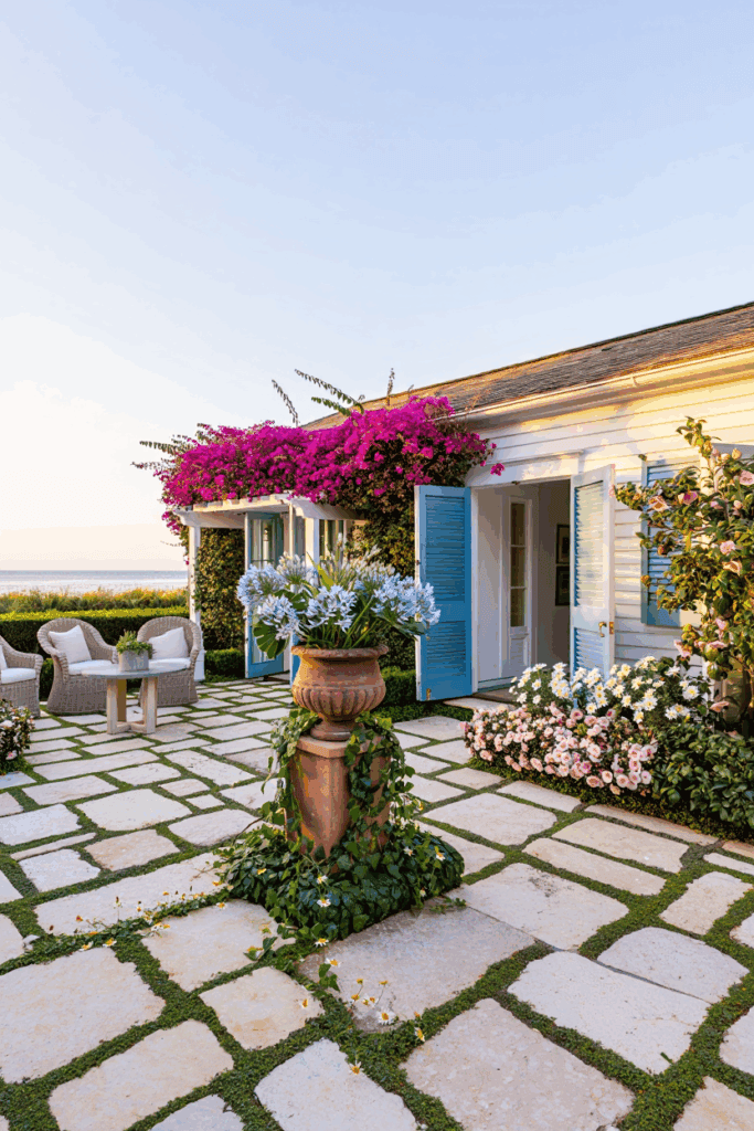 Small spaces don’t need compromise; they need focus. Here, the grid of pale limestone pavers stitched with green joints creates instant order, making the floor feel designed rather than leftover. Terracotta pots hold Mediterranean staples — lavender, rosemary, and geraniums — chosen for fragrance and resilience. The star is the bougainvillea, climbing freely against pale fencing, its magenta bracts glowing against the neutral backdrop. To recreate this, lay square-cut stone in a precise grid, filling joints with thyme, mazus, or dwarf chamomile. Choose three to four terracotta pots in varied heights and plant with herbs and flowering accents for seasonal color. Anchor the space with one statement vine — bougainvillea in warm zones, mandevilla or clematis in cooler ones. A small mosaic-topped table with bentwood chairs finishes the look, giving you a breakfast spot that feels like Tuscany, even in a city courtyard.