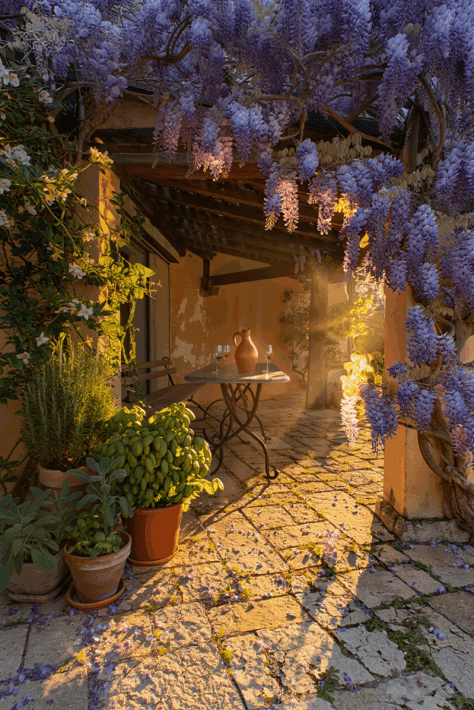 Romance needs structure. Build a pergola that can truly carry wisteria: posts set in concrete, beams bolted, wires run for lateral training. Plant Wisteria sinensis or W. floribunda and commit to a winter framework prune plus summer tip checks—discipline equals flower curtains. Keep the floor textured—aged stone with soft moss—so evening light rakes across and glows. Cluster terracotta pots by the posts: basil, rosemary, sage, and thyme make the space useful and aromatic; terracotta breathes and keeps roots steady. A small iron bistro table reads as an invitation rather than furniture. Where wisteria won’t thrive, use star jasmine, Pandorea, or even grape vines for shade and scent. Low-watt uplights aimed through the canopy create that cinematic “gold dust” at sunset. Simple palette, strong bones, scent on the breeze—this is how tiny terraces feel like Tuscany.