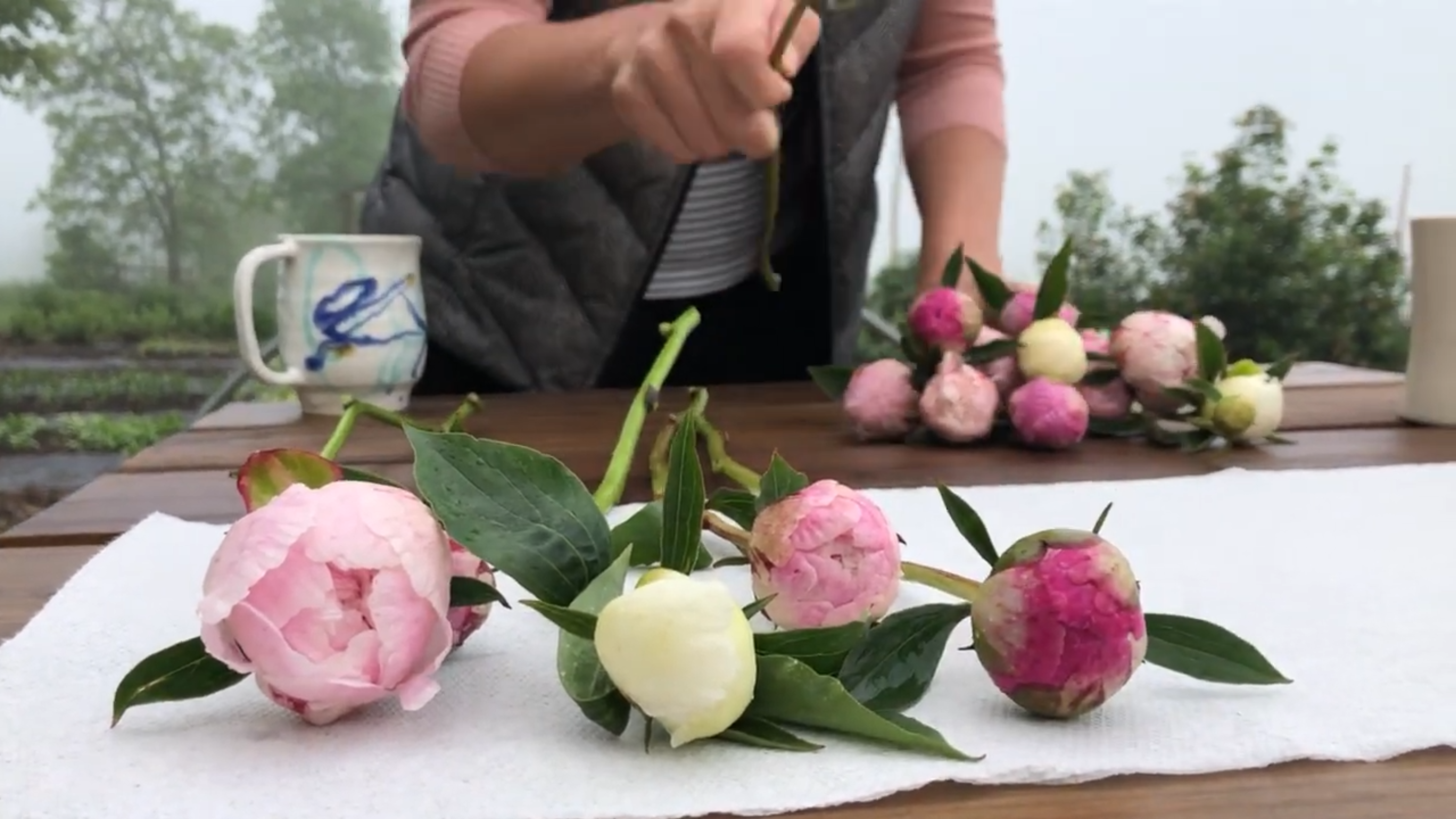 For single peonies, you can cut them when they’re a bit firmer. However, for fuller, double peonies, let them mature a bit more before cutting. This slight maturity ensures they open up well after storage. Also, cut the stem as long as you can, as you’ll need to trim them again when you remove them from the refrigerator.